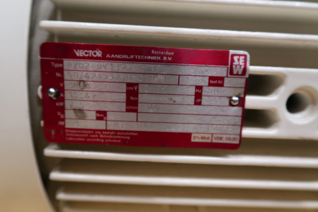 Electric motor with drivework. Motor: 7,5 kW - 349 rpm - 15,47 A - 50 Hz. Axle with spline. Forced air cooling Wistro A2D265-AA02-10. Total dimensions: 85 x 28 x 38 cm.