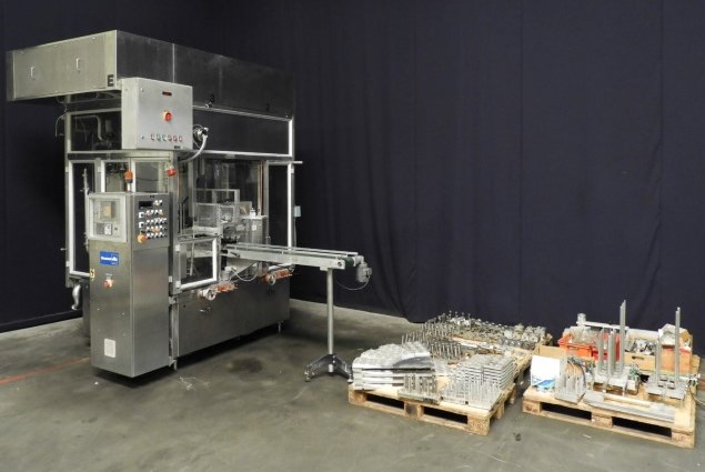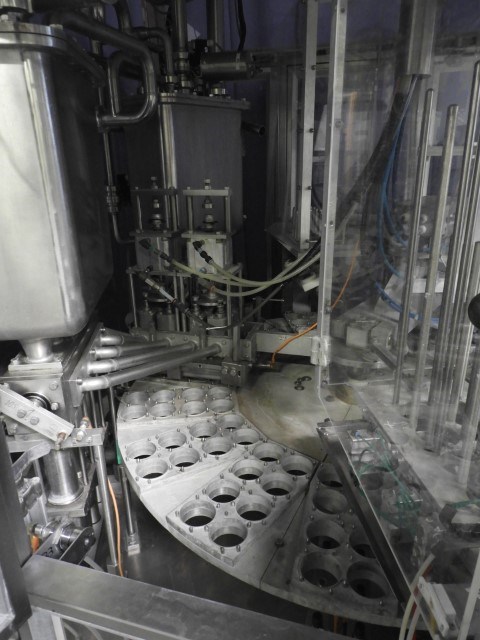 Rotatry filler with 8 Heads. 3 Formats: cup size round: 68 mm and 71 mm and 'duocup' 2x 70 mm. Stations: cup destacking, no cup detection by photocell, main piston doser (100 - 250 ml) with cup lift and hopper (CIP cleanable), seal dispending by vacuum, heat sealing, date coder by embossing ink, outfeed conveyor. Machine has plexiglas safety guards. Machine is in clean configuration with a hepa sterile air system. Easy format change (turn table in 4 parts). Controls: Siemens, model: S5 and cam corder HMI. Documentation available. Total outer dimensions lxwxh: 350 x 250 x 320 cm.