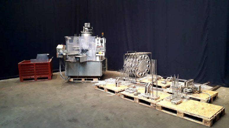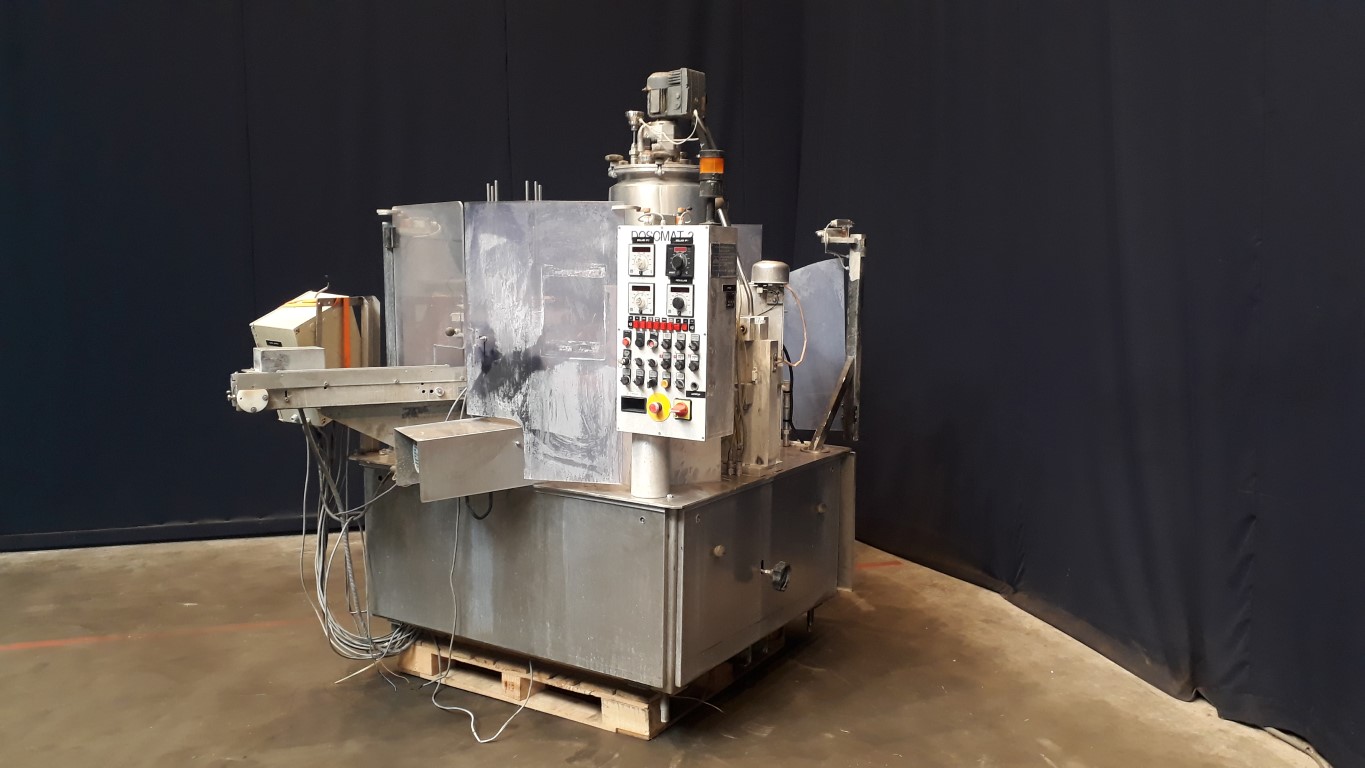2 head Rotary filler, sealing and snap cap. 5x Format sets with the machine. Currently on the machine format 01: Rectangular ± 150 x 110 mm (only 1 cup filling at the time, capacity max 2000 cups/h), Format 02: round: ± 80 mm, Format 03: round: ± 90 mm, Format 04: round ± 105 mm and Format 05: round ± 110 mm. Stations: cup destacking, main piston doser for viscose products with double jacketed hopper with agitator in hopper for hot fill (CIP cleanable), preformed seal dispending by vacuum, heat sealing, snap-on lid, outfeed on +/- 1 meter single lane outfeed conveyor. Machine has Plexiglas safety guards. Easy format change. Relay controlled with on/off switches.