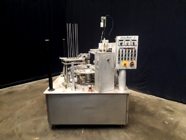 Rotary filling, sealing and snap cap machine. 12-Steps. Cup size oval: ± 122 x 80 mm. Incomplete format set on the machine. Stations: cup destacking, main piston doser for viscose products (100 - 500 ml, excluding hopper and filling valve), preformed seal dispending by vacuum with tip sealing, heat sealing, date coder on seal station, snap-on lid, outfeed, (outfeed conveyor missing). Including Busch 010-118 vacuumpump. Total dimensions: 160 x 160 x 220 cm.