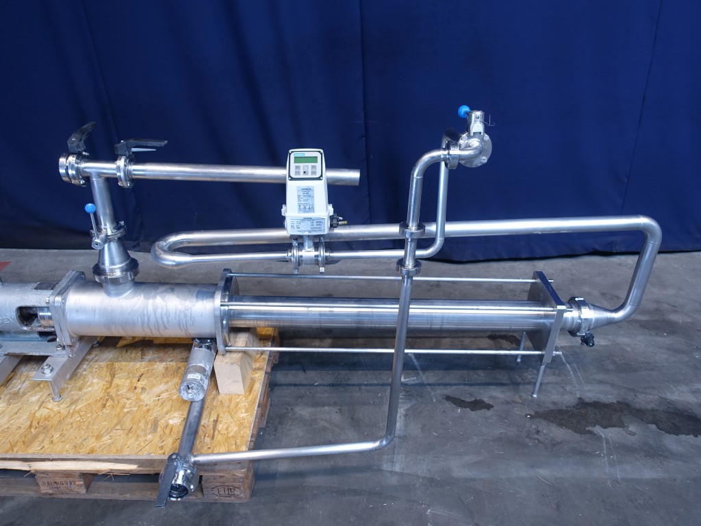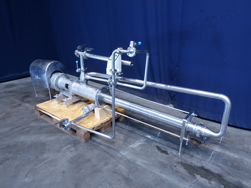 Mono / Screw pump. Stator length 110 cm. Max pressure 16 bar. Current motor: 4 kW - 8,8 A - n1: 1420 rpm - i = 22,19 - n2 = 64 rpm. Pneumatic by-pass. Stainless steel cover over electric motor. Including Siemens flowmeter on outlet. Connections: 2'' / 2'', DIN. Total dimensions: 90 x 330 x 130 cm.