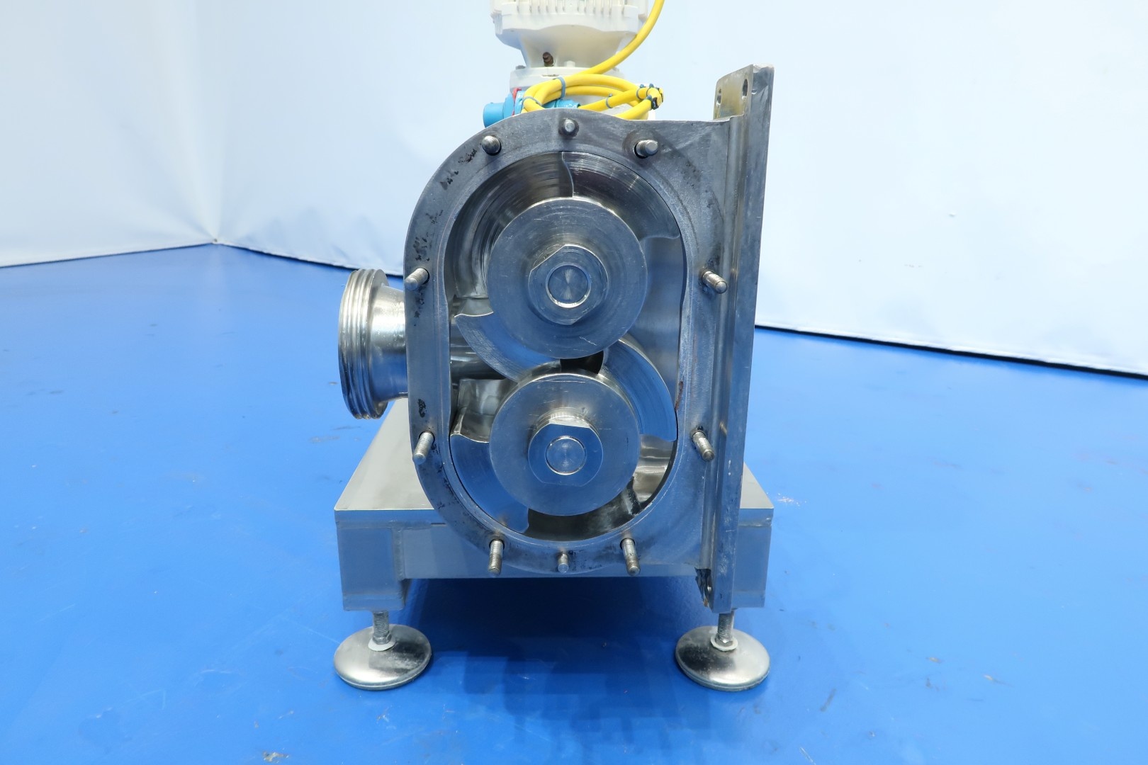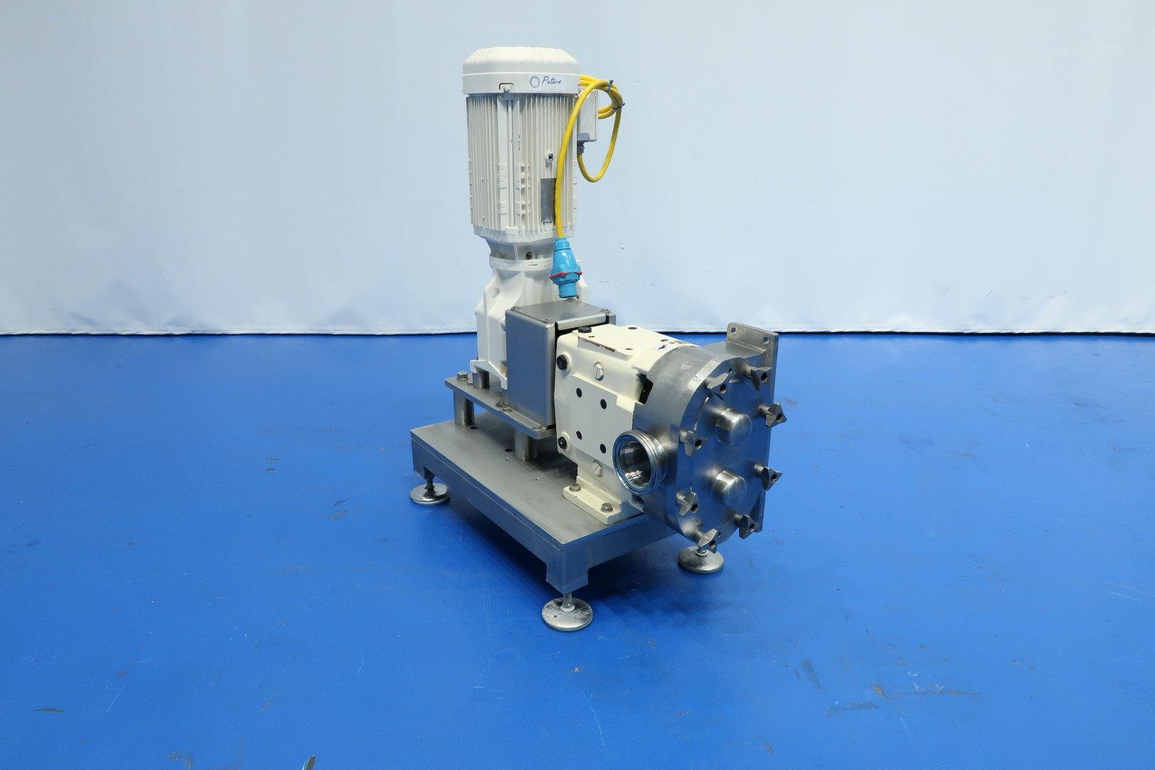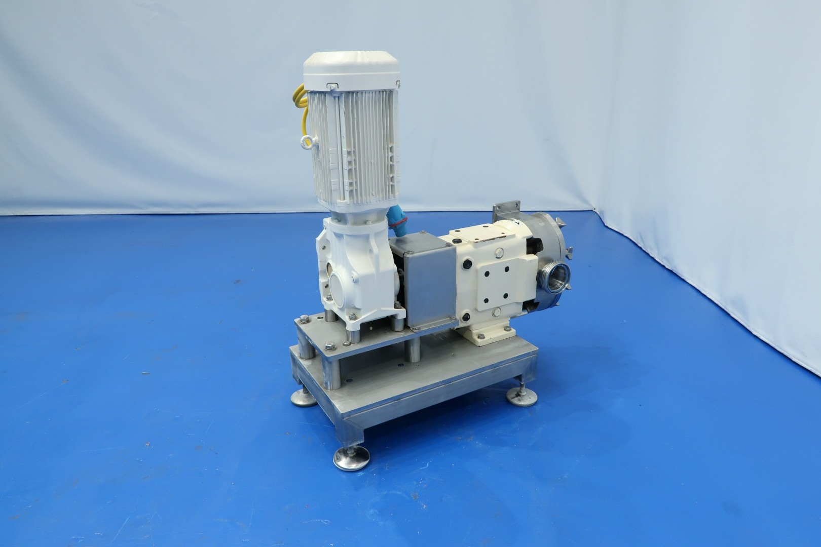 Lobbe pump with duo stainless steel lobbes. Equipped with vertically angled drivework. Nominal capacity ± 3m3/h. Current drive work: motor: 5,5 kW - 11,0 A - n1: 1.464 rpm, i= 15,19, n2: 96 rpm. Mounted on SS plate-frame with adjustable feet. Rectangular flance direct connected to the silo round 4" out. Belongs to butter silo STN15916 (only offered together).