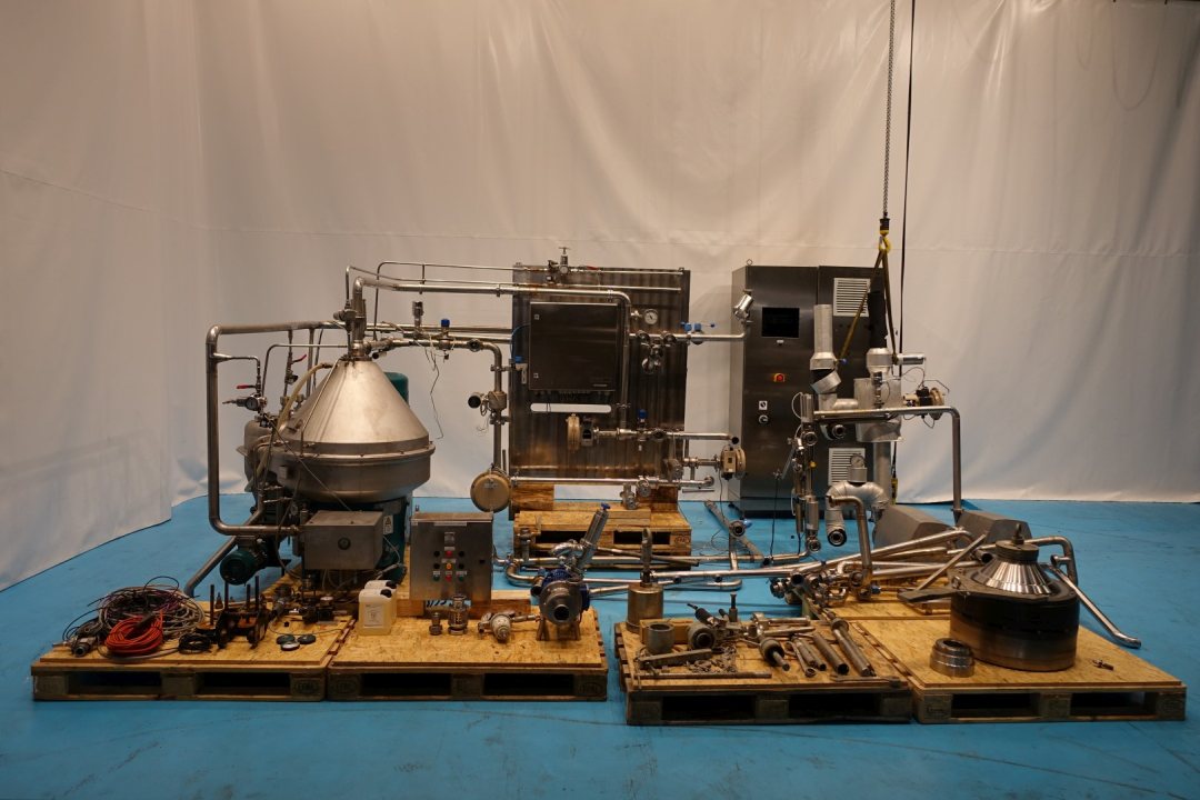 Beer separator - clarifier, self-cleaning. Including bowl, bowl speed: 7.250 rpm, motor cover, solids cyclone with a Seipec eccentric screw pulp outfeed pump, 3 x centrifugal pump, piping,co2 injection valve for blanketing, turbidity sensor , pressure transmitter, Vibro sensor. Flow transmitter, flow control valves, bypass valve, sampler on in and outlet. Maneuvering water valves. Set of needed tools with ring key and pressing tool. Free standing control panel with PLC Siemens Simatic S7-300 controls and frequency controllers of 2 pumps and separator. Centrifugal pump 1: GEA TP2050-200-2-E-K-E-GO-DN65/50-J-J, impellor 200 mm, connections In: 3,0" Din - Out: 2,5" Din. Centrifugal pump 2: GEA TP3050-150-2-E-K-E-GO-DN65/50-J-J, impellor 150 mm, connections In: 3,0" Din - Out: 2,5" Din. Centrifugal pump 3: NN, impellor 120 mm, connections In: 2 "Din - Out: 2" Din. Capacity: 10hl to 20hl/h. With documentation. Excluding: touchscreen in control panel, precooler PHE.